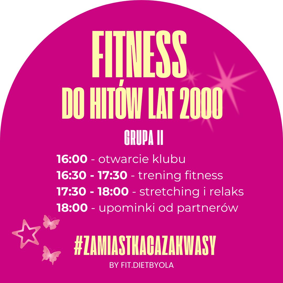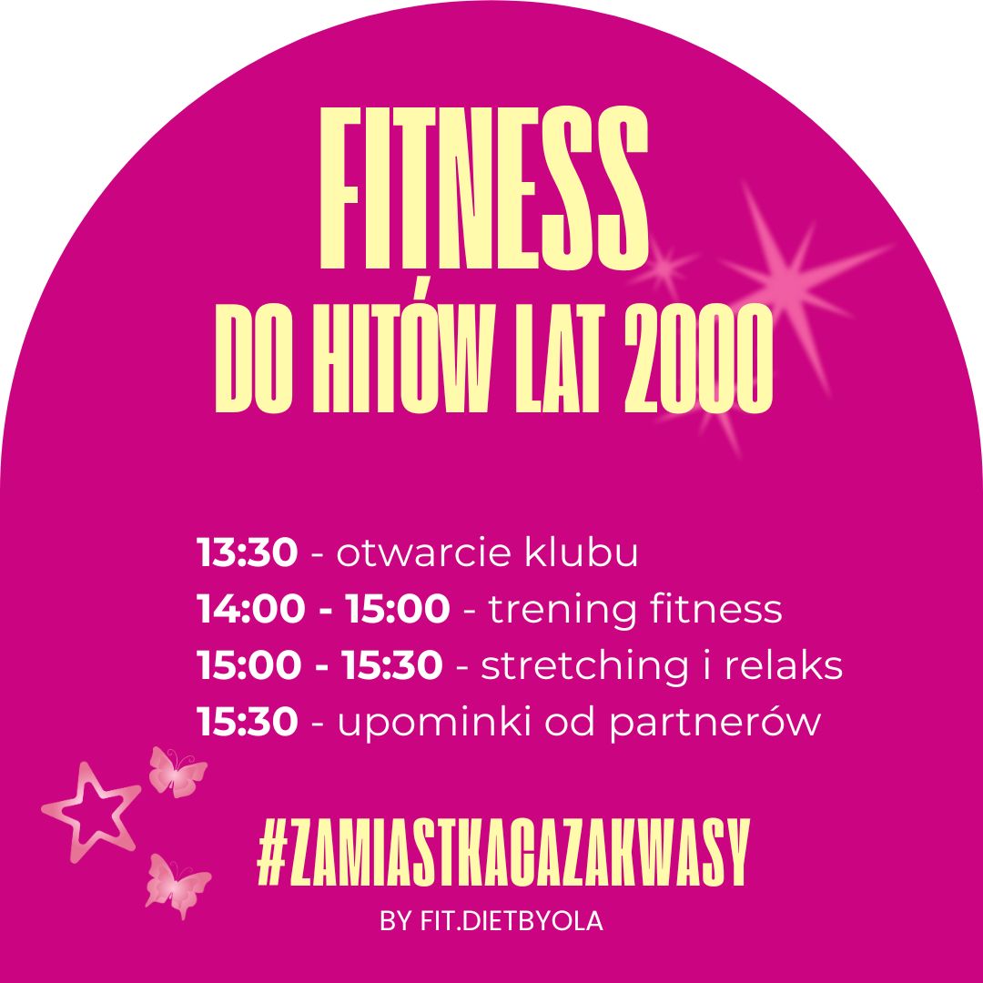 Fitness do hitów lat 2000–2010 to energetyczne wydarzenie łączące trening fitness, taniec i stretching z klubową zabawą. Dynamiczna muzyka serwowana przez DJ-a na żywo, kultowe kawałki, pulsująca energia i imprezowa atmosfera sprawiają, że spalasz kalorie, rozładowujesz stres i wychodzisz naładowana endorfinami. To idealna propozycja dla każdego, kto kocha ruch, rytm i dobrą zabawę. W końcu #ZAMIAST KACA ZAKWASY. ??