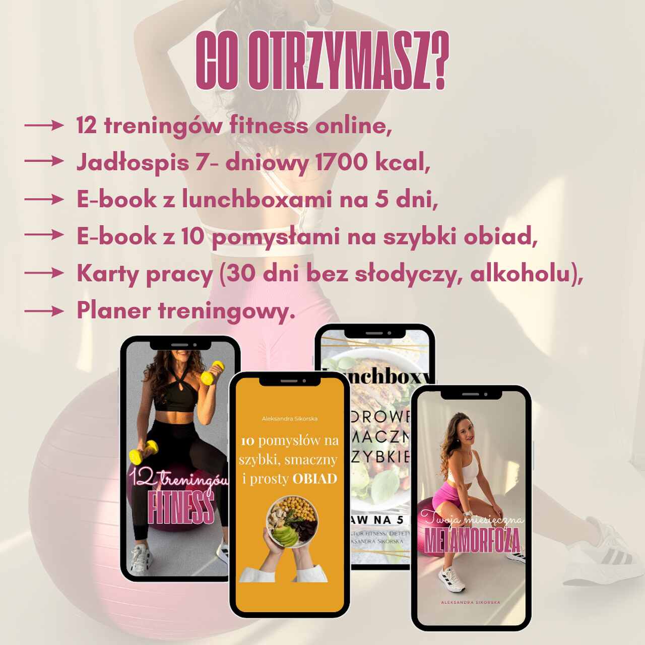 Jestem Aleksandra Sikorska – certyfikowana instruktorka fitness i pasjonatka zdrowego stylu życia. Od ponad 6 lat pomagam ludziom w osiąganiu ich celów zdrowotnych i sylwetkowych. Moje wyzwania, takie jak Twoja Miesięczna Metamorfoza, są zaprojektowane tak, aby motywować, wspierać i wprowadzać trwałe zmiany w życiu uczestników.