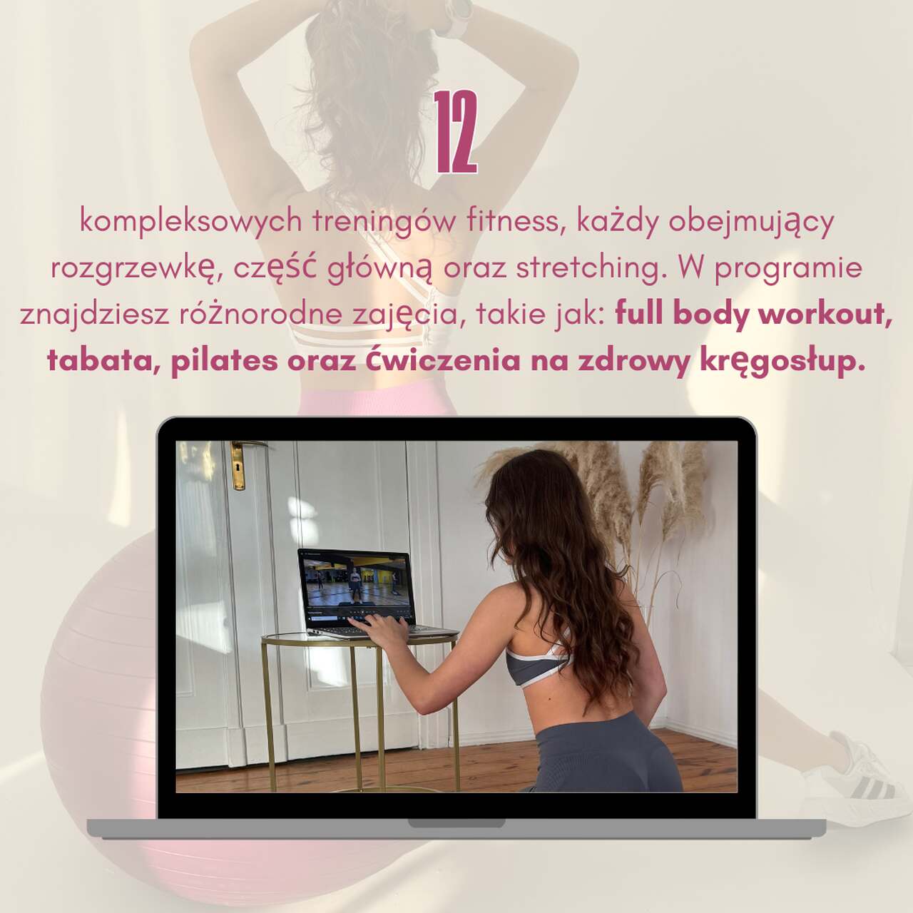 - 12 treningów online – dostosowane do Twojego poziomu i dostępne na każdym urządzeniu. Treningi nie wymagają specjalistycznego sprzętu i możesz wykonywać je w domu. Znajdziesz tam m.in. treningi wzmacniające full body Workout, pilastes, zdrowy kręgosłup.